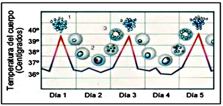 Giai đoạn tiềm tàng hay trước khi xuất hiện triệu chứng lâm sàng ở người dao động khoảng 12 - 20 ngày. Một số thể tồn tại trong gan phát triển chậm lại và tái phát xa (relapse) có thể xảy ra cơn sau đó và có thể sau thời gian 4 năm kể từ sau nhiễm bệnh. Chu kỳ phát triển trong máu kéo dài khoảng 49 giờ. Một hồ sơ kiểm tra từ các ca nhiễm chỉ ra số cơn sốt trung bình là 10.3 (fever episodes) có thân nhiệt ≥ 1010F và 4.5 cơn sốt với ≥ 1040F. Mật độ KSTSR trung bìnhlà 6.944/microl cho nhiễm thể thoi trùng và 7.310/microl cho nhiễm thể tư dưỡng. Tái phát có thể xảy ra sau khi một thời gian dài, có thể lên đến 4 năm sau khi nhiễm lần đầu.