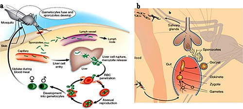Các giai đoạn trong muỗi: một con muỗi ăn phải các giao bào trong các động vật có vú. Các giao bào này óc thể là giao bào dạng microgametocytes (sau này thành giao bào đực) hoặc dạng macrogametocytes (sau này thành giao bào cái). Các giao bào này trưởng thành lần lượt thành microgametes và macrogametes và rồi chúng hình thành zygotes bên trong ruột muỗi nhờ vào giai đoạn thụ tinh. Các zygotes trưởng thành thành ookinetes, rồi oocysts. Cuối cùng, các oocysts trưởng thành thành sporozoites di chuyển đến tuyến nước bọt của muỗi, có thể tóm tắt: gametocyte → (microgamete hoặc macrogamete) → zygote → ookinete → oocyst → sporozoites.