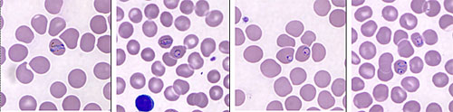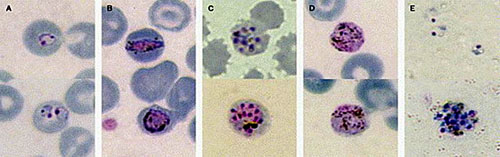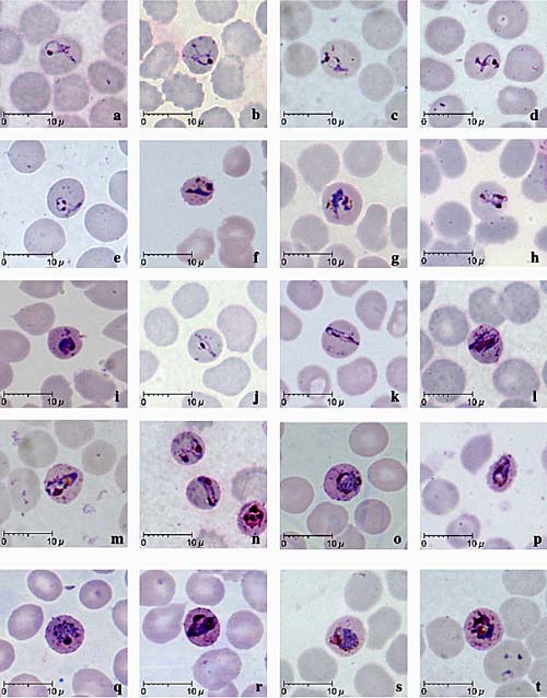 -Hình phiến máu giọt đàn cho thấy 2A) thể nhẫn, 2B) Tư dưỡng non dạng mãnh mai, 2C) Tư dưỡng đang phát triển hình dãĩ băng, 2D) thể tư dưỡng đang phát triển với dạng ít biến hình hoặc không không biến hình, 2E) thể tư dưỡng đang tăng trưởng nhân đôi, 2F) thể phân liệt trẻ, 2G) thể phân liệt già trong hồng cầu với hình gai ở rìa và 2H) thể giao bào trưởng thành, lớn. 2C, 2D và 2F) hiện diện chấm đậm – sáng của Sinton và Mulligan;