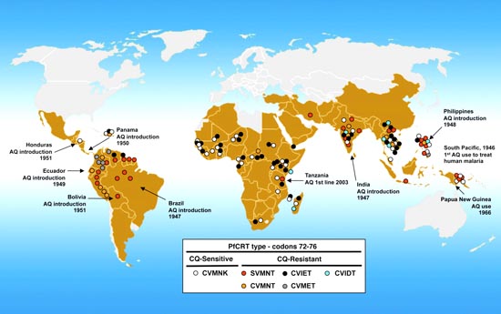 Kết quả cho biết sốt rét Plasmodium vivax kháng với CQ được báo cáo đầu tiên cách nay 12 năm và gần 30 năm sau nhận ra P. falciparum kháng CQ. Giờ đây, mất hiệu lực CQ đã cho thấy một vấn đề nghiêm trọng trong khâu sự phòng và điều trị bệnh này. Sự đột biến trong protein không bào tiêu hóa đã được mã hóa bởi một 13-exon gene, pfcrt chỉ ra gần đây về vai trò trung tâm đối với kháng thuốc CQ của P. falciparum. Có sự đột biến hay không trong pfcrt orthologues của các loài Plasmodium khác liên quan đến kháng CQ vẫn còn là câu hỏi mở. Báo cáo này mô tả pfcrt homologues từ P. vivax, P. knowlesi, P. berghei và Dictyostelium discoideum. Synteny giữa các gen P. falciparum và P. vivax đã được chỉ ra. Tuy nhiên, một nghiên cứu trên các phân lập bệnh nhân và các dòng (line) thích nghi với khỉ cho thấy không có mối liên quan nào trên in vivo CQR và đột biến codon trong gen của P. vivax. Đây là bằng chứng mà các dữ kiện phân tử về kháng CQ do P. vivax khác với trên P. falciparum.