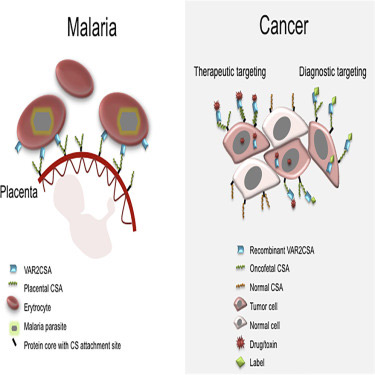 Ký sinh trùng sốt rét P. falciparum trong tế bào hồng cầu trình diện các protein sốt rétVAR2CSA. VAR2CSA liên kết với một loại chondroitin sulfate nhất định diễn ra đặc biệt trong nhau thai. Việc thay đổi chondroitin sulfate giống nhau diễn ra ở hầu hết tế bào ác tính và có thể hướng đến việc tái tổ hợp VAR2CSA (rVAR2). Trong các khối u, các chuỗi chondroitin sulfate hệt như trong nhau thai được liên kết với các proteoglycan liên quan đến ung thư bao gồm CD44 và CSPG4. Các protein rVAR2 khoanh vùng đến các khối u trong cơ thể và kết hợp với độc tố bạch cầu hoặc với hợp chất hemiasterlin làm ngăn chặn sự tăng trưởng và di căn của tế bào khối u trong cơ thể. Dữ liệu nghiên cứu chứng minh làm thế nào để một protein ký sinh trùng tinh chế có thể được khai thác những thay đổi của glycosaminoglycan liên kết ác tính, phổ biến, nhưng phức tạp. Điểm đáng chú ý về công trình và tình cờ này là khi phát hiện trong nhau thai và tế bào ung thư đều tạo ra oncofetal chondroitin sulfate như nhau, các oncofetal chondroitin sulfate được tìm thấy ở proteoglycan trong tế bào ung thư. Protein tái tổ hợp VAR2CSA phát hiện những thay đổi của chondroitin oncofetal, có thể hướng đến mục tiêu điều trị ung thư ở người một cách rộng rãi bởi hợp chất thuốc sốt rét VAR2CSA trong cơ thể.