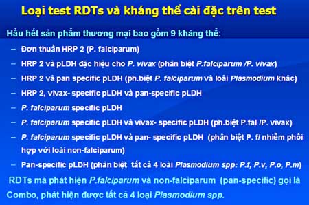 Trong vòng 10 năm gần đây, test chẩn đoán nhanh sốt rét (RDTs) đã được sử dụng phổ biến ở tất cả các tuyến y tế ở nước ta nhằm hỗ trợ phương pháp xét nghiệm cổ điển giem sa trong chẩn đoán ký sinh trùng sốt rét, sự có mặt của RDTs đã giúp cho việc phát hiện sớm, chẩn đoán sớm và điều trị kịp thời bệnh sốt rét; tuy nhiên cũng cần chú ý khi phiên giải kết quả nhằm đảo bảo tính chính xác của các test này trước khi quyết định chẩn đoán và điều trị.