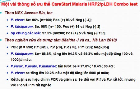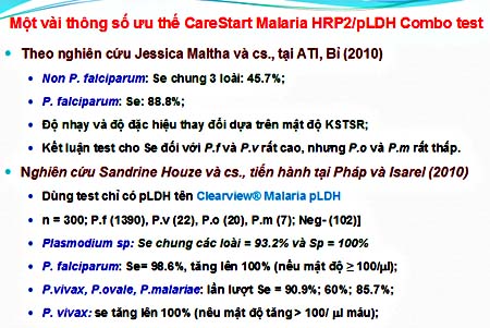 Vì đây cũng là một trong danh mục gần 100 loại test chẩn đoán nhanh đệ trình đánh giá trong thời gian gần đây đã có két quả và chấp thuận của các cơ quan chuyên trách, nên cũng đã có một số cơ sở nghiên cứu đánh giá về độ nhạy và độ đặc hiệu của test trong phạm vi đa trung tâm và chi tiết. Bảng trên đã cho thấy kết quả từ các công trình nghiên cứu tại châu Âu, châu Phi và Đông Nam Á đã cho biết độ nhạy và độ đặc hiệu của test CareStart Malaria HRP2/pLDH Combo test rất cao (độ nhạy Se: đạt từ 88.8% lên đến 99.8%; độ đặc hiệu đạt Sp: 95% - 100%). Các thông số và giá trị khác của test như giá trị dự kiến âm tính, giá trị dự kiến dương tính, độ chính xác cũng rất cao và trên 95%. Song các giá trị hoặc thông số này - theo các nghiên cứu tiến hành tại nước ngoài cho biết các giá trị đó cao chỉ đối với việc phát hiện P. vivax và P. falciparum; riêng đối với P. malariae và P. ovale thì cho độ nhạy và độ đặc hiệu của test này khá thấp. Do đó, việc áp dụng các test này vào mục đích của người sử dụng là cần xem xét các vấn đề ưu và nhược điểm của test.