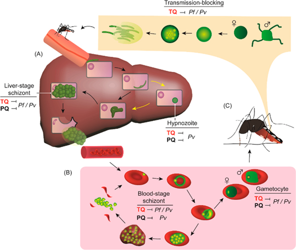 Các mũi tên màu vàng chỉ ra thể ngủ của P. vivax (Pv) phát triển trong tế bào gan nhưng không xảy ra đối với loài P. falciparum (Pf). TQ-tafenoquine; PQ-primaquine.