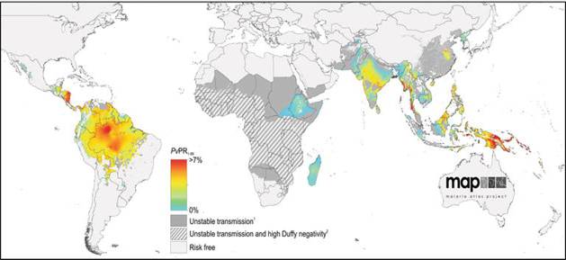 Hình 1. Bản đồ toàn cầu về P. vivax với các mức độ khác nhau
