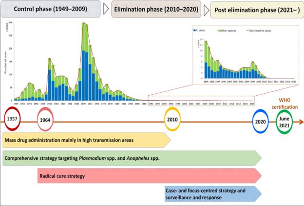 Ca nhiễm P. vivax nội địa gần đây nhất được ghi nhận vào năm 2016 và kể từ đó không có ca nội nhiễm nào được báo cáo. Tuy nhiên, hàng trăm ca sốt rét P. vivax ngoại nhập đã được báo cáo hàng năm, chủ yếu là do số lượng người lao động hoặc doanh nhân Trung Quốc làm việc ở nước ngoài ngày càng tăng, đặc biệt là từ Đông Nam Á và châu Phi - nơi sốt rét còn lưu hành phổ biến.