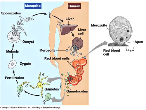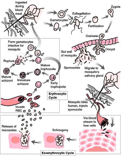 4.Các giai đoạn sinh sản bắt đầu khi muỗi hút máu từ các vật chủ có nhiễm giao bào trưởng thành. Trong muỗi, các giao bào chuyển dạng thành gamete đực và cái và phát triển thành một zygote. Các zygote này trở thành một ookinate xâm nhập vào các mô của ruột muỗi và cuois cùng thành oocyst. Khi oocyst vở ra hàng ngàn sporozoites lồi ra và chu du trong tuyến nước bọt của muỗi và từ đó chúng sẽ có điều kiện để truyền sang vật chủ khác khi muỗi đốt máu.
