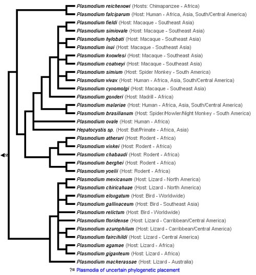 Một giả định thuộc về trực giác rằng các nghiên cứu về mặt phân tử là một thử thách sớm thật lý tưởng và có liên quan mật thiết với các ký sinh trùng sốt rét ở người. Giờ đây, các công trình nghiên cứu mới đây chỉ ra, mặc dù các loài ký sinh trùng trên loài linh trưởng (ngoại trừ P. falciparum và P. reichenowi) tạo nhóm với nhau, thì các ký sinh tùng sốt rét này với vật chủ người là không liên quan trong nhóm này.