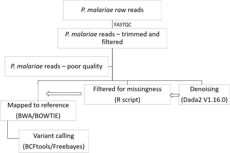 P. malariae raw reads: Các đoạn đọc thô của P. malariae; P. malariae reads -trimmed and filtered: Các đoạn đọc P. malariae-đã cắt tỉa và lọc; P. malariae reads-poor quality: Các đoạn đọc P. malariae - chất lượng kém; Mapped to reference (BWA/BOWTIE): Ánh xạ với bộ tham chiếu (BWA/BOWTIE); Filtered for missingness (R script): Lọc thiếu dữ liệu (R script); Variant calling (BCFtools/Freebayes): Gọi biến thể (BCFtools/Freebayes); Denoising (Dada2 V1.16.0): Khử nhiễu (Dada2 V1.16.0)