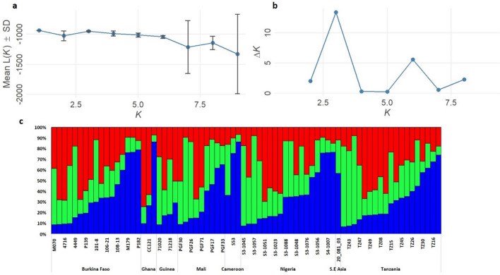 Hình 4. Phân biệt quần thể và nguồn gốc bằng phương pháp STRUCTURE cho thấy giá trị K tối ưu (K = 3) theo phương pháp của Evanno: (a) Giá trị trung bình của K và (b) ΔK. (c) Biểu đồ dạng thanh thể hiện xác suất phân bổ Bayesian cá nhân của microsatellite đối với P. malariae từ các quốc gia khác nhau theo mô hình pha trộn.