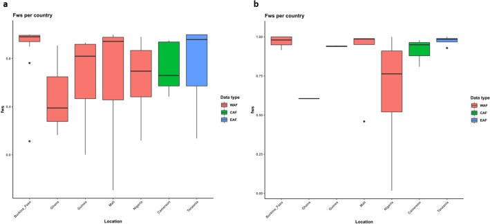 Các nhiễm trùng có kiểu gen hỗn hợp (giá trị FWS < 0,95) đã được xác định trong dữ liệu SNP từ tất cả quần thể, mặc dù hầu hết mẫu phân lập có giá trị FWS cao từ dữ liệu đã khử nhiễu, cho thấy một kiểu gen chiếm ưu thế duy nhất (Hình 5a, b). Các mẫu phân lập từ Nigeria và Ghana có giá trị trung bình FWS thấp nhất, do đó cho thấy sự phức tạp cao hơn.