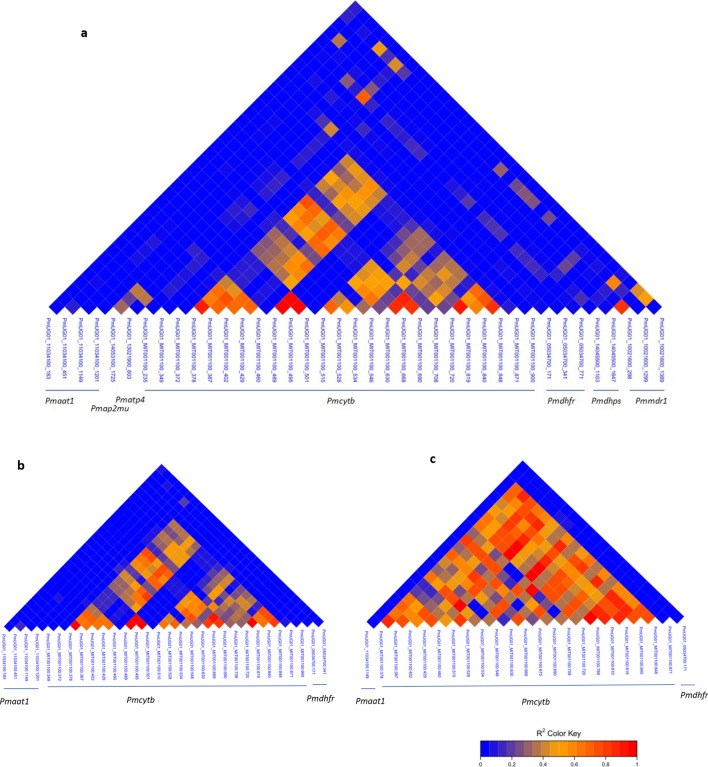 Bản đồ nhiệt liên kết mất cân bằng (LD) cho thấy các mẫu hình LD đáng kể giữa các SNP trên các gen kháng thuốc tương đồng. Giá trị r² cao được quan sát thấy giữa hầu hết các SNP trên gen ty thể Pmcytb và giữa các SNP của Pmcytb với các SNP trên các gen mục tiêu khác như Pmdhps, Pmdhfr và Pmmdr1 từ bộ dữ liệu chưa lọc (Hình 6a). Liên kết mất cân bằng cao quan sát được ở các SNP của ty thể vẫn được duy trì trong cả hai bộ dữ liệu đã lọc và đã khử nhiễu (Hình 6b,c).