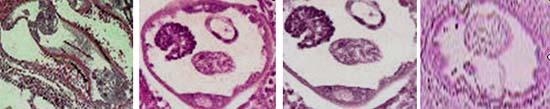 Cắt con giun A.cantonensis trong khoang dưới nhện với tổ chức viêm và xuất huyết (khi nhuộm hematoxylin và eosin), bệnh sinh do A.cantonensis tùy dựa vào tổn thương trực tiếp gây ra bởi ấu trùng di chuyển và giun còn non (dài 7-13mm x 100-260µm) và phản ứng u hạt viêm.