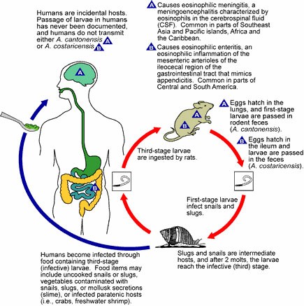 Người bị nhiễm do ăn phải ốc, con sên, rau hoặc vật chủ truyền nào đó chưa được nấu chín; ở người, ấu trùng di chuyển đến hệ thần kinh trung ương, ở đó sự phát triển của chúng dừng lại và gây ra viêm não- màng não tăng bạch cầu eosine. Khi chúng đẻ và giải phóng ra ấu trùng giai đoạn 1 (L1), ấu trùng này sẽ di chuyển đếnruột non thông qua đường khoang phế nang, khí quản, hầu và thực quản; rồi ấu trùng đào thải cùng với phân. Ấu trùng L1 nhiễm vào các vật chủ trung gian thứ nhất là các loài nhuyễn thể (ốc và sên), ở đó chúng phát triển thành ấu trùng gây nhiễm giai đoạn ba (L3). Các con chuột bị nhiễm do ăn phải ốc hoặc sên có dính ấu trùng L3, ấu trùng trong chuột sẽ di chuyển từ ruột đến hệ thần kinh trung ương và trưởng thành tại đó trải qua 2 giai đoạn phát triển trong thời gian 2 đến 3 tuần. Tiếp đến các con giun trưởng thành đến khoang dưới nhện, vào trong hệ tĩnh mạch, vào động mạch phổi và trưởng thành đến giai đoạn hoàn chỉnh. Ấu trùng có thể phát hiện ở phân chuột trong vòng 40-60 ngày sau nhiễm.