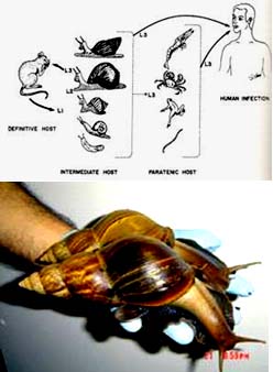 Khai thác bệnh sử một số nhóm nghiên cứu ghi nhận bệnh nhân mắc loại KST này có liên quan đến bệnh là có tiền sử ăn ốc sống hoặc các chế phẩm tái sống từ ốc, hoặc ăn các loại rau thủy sinh dính chất nhớt từ ốc (52-64%) trước đó. Tuy nhiên, đây có thể là tập quán ăn uống và thói quen ăn uống của học nên chỉ xếp vào loại có nguy cơ (!). Bệnh nhân nhập viện nhiều nhất vào 3 tháng cuối năm ở các quốc gia có khí hậu nóng ẩm, thời điểm này là 3 tháng cuối mùa mưa, ốc cũng như các loài nghuyễn thể, thực vật thủy sinh, phát triển mạnh nhất, con người khi đó lại sử dụng nhiều rau, ốc, tôm, cá làm thức ăn chính và nếu không được nấu chín thì dễ dàng nhiễm bệnh.