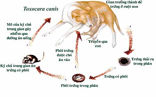 Khi một con chó tiêu hóa hay ăn phải trứng thụ tinh, ấu trùng đẻ ra trong ruột non. Trên các chó con nhỏ hơn 4-5 tuần tuổi, ấu trùng xuyên thành ruột non và được mang đi đến phổi nhòe dòng tuần hoàn, ở đó chúng đi vào phế nang phế quản nhỏ và khí quản. Các ấu trùng vào trong hầu và được nuốt xuống. Khi ký sinh trùng đến ruột non lần thứ hai, chúng sẽ phát triển thành con trưởng thành, phối nhau và đẻ trứng. Các ấu trùng chưa trưởng thành cũng đôi khi tìm thấy trong phân.Giun T. canis trưởng thành có một tuổi thọ khoảng 4 tháng trong ruột non và hầu hết ký sinh trùng bị đẩy ra trong vòng 6 tháng sau nhiễm. Khi các con chó con lớn hơn và chó trưởng thành tiêu hóa trứng, một sự gia tăng tỷ lệ ấu trùng sẽ thất bại khâu di chuyển qua phổi. Các ấu trùng này chu du thay vì đến cơ, gan, thận và các tạng khác, ở đó chúng trở nên trạng thái “ngủ”.Chó ở bất kỳ lứa tuổi nào có thể phát triển sự nhiễm trùng độc quyền nếu chúng ăn các mô chứa ấu trùng thể ngủ này [dormant (hypobiotic) larvae], chẳng hạn, ấu trùng tìm thấy trong con mồi. Các ấu trùng này có thể trưởng thành trong ruột non của chó mà không cần quá trình di chuyển thêm. Các ấu trùng dạng “hypobiotic” đóng vai trò như một ổ chứa nhiễm trùng trên các con chó có thai. Chúng trở nên tái hoạt trong suốt giai đoạn cuối của thai kỳ và nhiều rồi chúng đi vào tử cung hoặc tuyến vú, ở đó chúng nhiễm vào thai hoặc các con chó con.