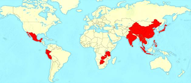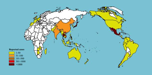 Hình 1a. Phân bố bệnh do ấu trùng Gnathostoma spp.trên toàn cầu