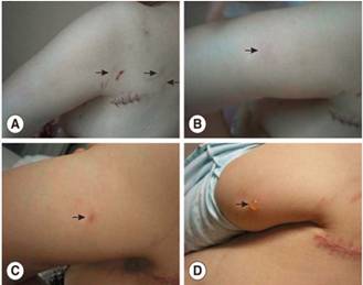 Hình 2c. Ấu trùng Gnathostoma spp. di chuyển ở mô mềm đùi trên người lớn | Hình 2d. Ấu trùng Gnathostoma spp. di chuyển ở mô mềm vùng cằm người lớn |