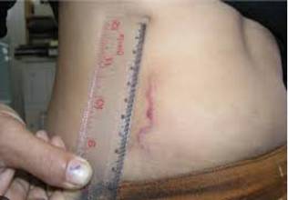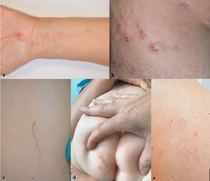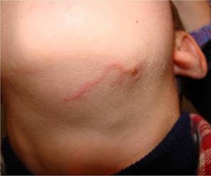 Hình 2a. Ấu trùng Gnathostoma spp. di chuyển dưới da ở bệnh nhân nữ 52 tuổi ở miền Trung của Trung Quốc | Hình 2b. Ấu trùng Gnathostoma spp. di chuyển ở mô mềm trên người lớn và đặc biệt ca 12 tháng tuổi ở Pháp ở vùng mông- quanh hậu môn |