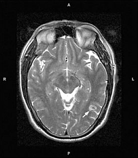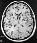 Hình 2. trên hình ảnh CT có nang của ATTSL thể thần kinh trong nhu mo não đặc | Hình 3. hình ảnh cộng hưởng từ cho thấy các nang của ATSL thể thần kinh trong nhu mô |