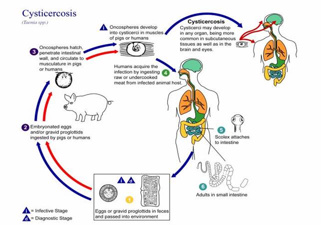 Chu trình tự nhiễm liên quan đến nhiễm trùng ngược dòng của các đốt sán từ ruột non đến dạ dày và ly giải các trứng của sán dây T. solium bên trong ruột người. Tiêu hóa hoặc ăn phải các thịt heo bị đóng kén nang ấu trùng sẽ không trực tiếp gây ra bệnh ấu trùng sán lợn. Nói đúng hơn, nó sinh ra quá trình nhiễm ở ruột với các sán dây trưởng thành và tình trạng mang mầm bệnh đối với trứng T. solium, khi người tiêu hóa phải sinh ra các triệu chứng lâm sàng của bệnh ấu trùng sán lợn. Thậm chí, ngay cả khi người đó không ăn thịt heo (chẳng hạn rau) có thể phát triển thành bệnh ấu trùng sán lợn. | Hình 1: Chu kỳ của ấu trùng sán dây lợn |