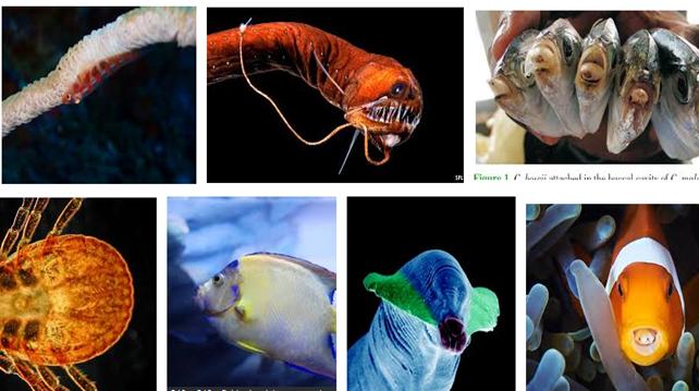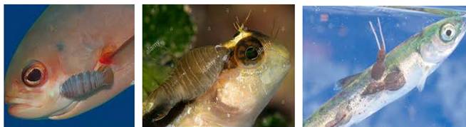 Ấu trùng của họ Gnathiidae và các cymothoidids trưởng thành có công cụ sắc nhọn và có phần miệng hút và chân có móng vuốt thích nghi với việc leo trèo trên các vật chủ của chúng. Cymothoa exigua là loại ký sinh trùng của nhiều loại cá biển khác nhau. Nó có thể gây ra lưỡi của cá phì đại. Các rối loạn ký sinh trùng khác gồm có Gyrodactylus salaris, Ichthyophthirius multifiliis, cryptocaryon, bệnh velvet, Brooklynella hostilis, các lỗ trong đầu, Glugea, Ceratomyxa shasta, Kudoa thyrsites, Tetracapsuloides bryosalmonae, Cymothoa exigua, đĩa, sán lá, chấy và rận trên cá hồi. Mặc dù, các ký sinh trùng nhìn chung coi là có hại, việc loại bỏ các loại ký sinh trùng là không cần thiết. Các ký sinh trùng chiếm nhiều hơn một nửa đa dạng đời sống; chúng thực hiện các vai trò sinh thái quan trọng mà hệ sinh thái mất thời gian thích nghi với, và nếu không có ký sinh trùng có thể dẫn đến sinh sản vô tính, giảm sự đa dạng dòng lưỡng hình giới tính. Các ký sinh trùng cung cấp một cơ hội cho chuyển dạng chất liệu di truyền giữa các loài. Hiếm hơn, nhưng có ý nghĩa, đôi khi điều này hỗ trợ sự thay đổi tiến hóa và ngược lại thì không xảy ra, hoặc mất thời gian hơn.