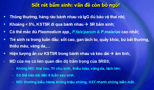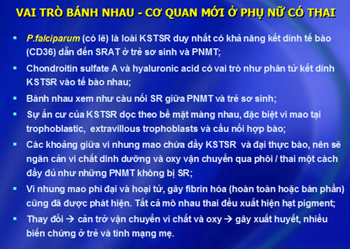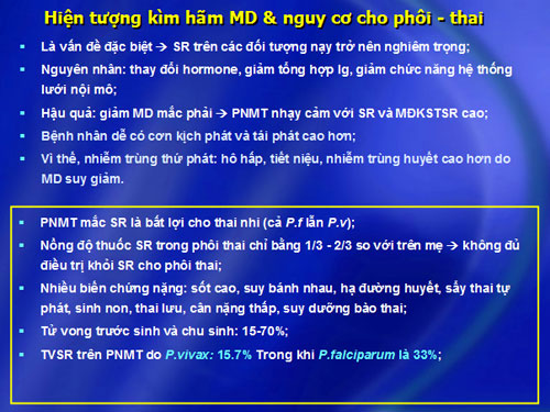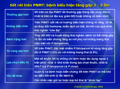 Nói tóm lại, nhiễm ký sinh trùng nói chung và sốt rét nói riêng trên các PNMT có các điểm cần lưu ý: sốt rét và thai nghén là tình trạng “đồng hành” khiến bệnh diễn biến sẽ nghiêm trọng hơn (1); Thay đổi sinh lý khi mang thai và thay đổi bệnh lý do SR trên các PNMT sẽ dẫn đến hiệu ứng “cộng hưởng” làm cho mỗi bên càng thêm phức tạp, nghiệm trọng hơn (2); Trẻ em từ khi phôi thai đến khi ra đời đối mặt với SR sẽ dẫn đến nhiều biến chứng và di chứng (3) và vấn đề SR trên các PNMT đã tác động không nhỏ trong việclàm suy giảm sức khỏe, kinh tế, xã hội và nhiều mặt khác.