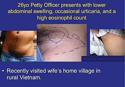* Vì ấu trùng di chuyển, bênh nhân có thể có dấu chứng và triệu chứng liên tục; do vậy, tổng số triệu chứng lâm sàng vượt quá con số bệnh nhân báo cáo |