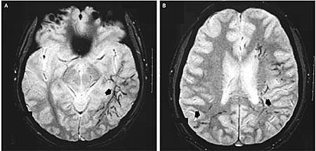 | MRI | Đa điểm (giống giun) tăng tỷ trọng T2 hoặc giảm tỷ trọng trong cả hai bán cầu não và tiểu não đường kính ≥ 3mm (vệt xuất huyết) có hoặc không có tăng thành phần gadolinium. |