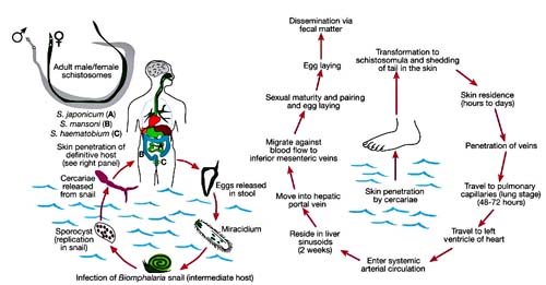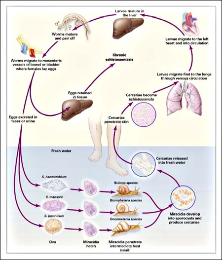 Các chu kỳ sinh học của 5 loại sán máng đều giống nhau: trứng ký sinh tùng ly giải vào trong môi trường do các cá thể nhiễm phóng thích, khi rơi vào trong môi trường nước ngọt, trứng phát triển thành thể miracidium bơi tự do trong nước Miracidia nhiễm vào trong ốc nước ngọt khi chúng xuyên qua chân ốc. Sau khi nhiễm, chúng bám chặt vào vị trí xuyên qua, miracidium chuyển dạng thành thể đầu tiên của sporocyst (mẹ). Các tế bào mầm bên trong sporocyst mẹ sẽ phân chia để tạo nên các thể sporocysts (con), rồi chúng di chuyển đến các tế bào gan tụy của ốc. Một khi ở trong tế bào gan tụy của ốc, các tế bào mầm bên trong thể sporocyst con bắt đầu phân chia trở lại, thời điểm này chúng sinh ra hàng ngàn ký sinh trùng mới, gọi là cercariae, chúng là các ấu trùng có khả năng nhiễm vào các loài động vật có vú.