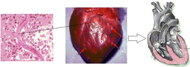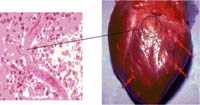 Hình 2a. Ấu trùng trong nhu mô cơ tim. Hình 2b. Viêm cơ tim dẫn đến dày, phù nề cơ tim