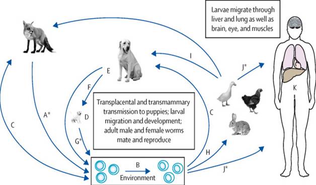 Toxocara canis vàToxocara cati là các loài giun tròn ở chó và mèo và là loại ký sinh trùng lây truyền từ động vật sang người ở đường tiêu hóa phổ biến nhất trên toàn cầu. Các vật chủ tự nhiên và người nhiễm phải do nuốt trứng có phôi chứa ấu trùng giai đoạn 3 từ đất do tay bẩn (tật ăn đất, phơi nhiễm với đất), nguồn rau sống hoặc ấu trùng trong các nguồn phủ tạng lòng, cổ, cánh, chân gà, thịt chế biến chưa chín còn mang ấu trùng. Ấu trùng Toxocara spp. vào trong dạ dày và di chuyển vào niêm mạc ruột non, đi xuyên qua mạch máu và bạch huyết khắp cơ thể và ký sinh vào trong các mô và cơ quan.Gan là vị trí quan trọng cho việc kiểm soát sự di chuyển của áu trùng Toxocara spp.Nhiễm trùng lan tỏa xảy ra thông qua con đường tuần hoàn và khoang cơ thể. Hội chứng lâm sàng kinh điển của nhiễm trùng Toxocara spp. chia thành ấu trùng di chuyển phủ tạng (visceral larva migrans-VLM) và ấu trùng di chuyển ở mắt (ocular larvamigrans-OLM). Hội chứng VLM hầu như ảnh hưởng lên gan, da, phổi, nhưng một số ca di chuyển vào cơ tim và não bộ.Trong thể OLM, ấu trùng di chuyển cso thể sinh ra tổn thương võng mạc dạng u hạt với biểu hiện giảm thị lực. Một hội chứng thứ ba còn gọi là bệnh ấu trùng Toxocara spp. ẩn mình(covert toxocariasis-CT) trên các bệnh nhân có triệu chứng lâm sàng không đặc hiệu và không thuộc phân loại VLM hay OLM, song thể này lại là một phức hợp triệu chứng mơ hồ. Tỷ lệ nhiễm Toxocara spp. rõ ràng trên chó và mèo cao nhất và thấp hơn trên các động vật trưởng thành tại nhiều quốc gia trên toàn cầu.