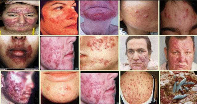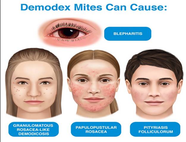 Viêm da do Demodex spp. nhiều lần và nghiêm trọng thường để lại da mặt thô ráp và xấu xí. Thông thường, các lỗ chân lông trên mũi, cằm, trán và má trở nên rộng hơn, mụn trứng cá có thể phát triển, sau một thời gian, da mặt có thể trở thành màu đỏ, các mao mạch nổi dày lên 2 bên cánh mũi. Cảm giác kiến bò trên da mặt: thường xuất hiện trên trán, mũi, má, đặc biệt là vào buổi tối và ban đêm.
