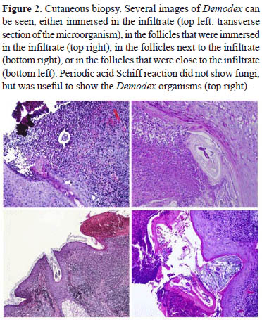 Viêm da do Demodex spp. thường đi khám với triệu chứng không đặc hiệu như ngứa mặt kèm theo đỏ da , vẩy da, mụn mủ ở nang lông, viêm da quanh miệng, viêm bờ mi, viêm da dầu hoặc giống trứng cá.