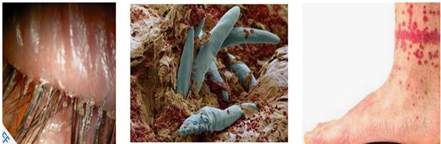 Chân tóc cũng thường bị nhiễm trùng với biểu hiện ngứa. Miệng của những con ký sinh trùng này giống như chiếc kim sắc, nó có thể đốt trực tiếp vào trong tế bào để hút chất dinh dưỡng. Demodex spp. ăn những tế bào chết, hormone và chất dầu có trong chất bã. Có thể di chuyển chậm với vận tốc 8-16 cm trong một giờ. Chúng thích môi trường ẩm ướt, ấm và thường hoạt động nhiều nhất trong bóng tối. Demodex spp. sống bên trong các tuyến bã nhờn và nang lông, hút chất dinh dưỡng và làm hư hại tế bào. Sau khi giao phối chúng đào hang vào da, đẻ trứng, gây nên nhiễm khuẩn và nhiễm trùng da. Trong suốt giai đoạn của chu kỳ cuộc sống của chúng, những con ve phá hủy da bài tiết chất thải, đẻ trứng và chết. Sau khi chết, xác chết của chúng trở thành chất lỏng và phân hủy bên trong da gây ra phản ứng dị ứng.