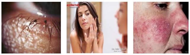 Thông thường, các lỗ chân lông trên mũi, cằm, trán và má trở nên rộng hơn, mụn trứng cá có thể phát triển, sau một thời gian, da mặt có thể trở thành màu đỏ, các mao mạch nổi dày lên 2 bên cánh mũi. Cảm giác kiến bò trên da mặt: thường xuất hiện trên trán, mũi, má, đặc biệt là vào buổi tối và ban đêm.