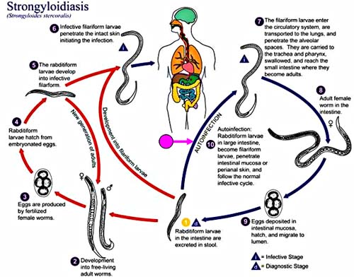 Nhiễm giun lươn Strongyloides stercoralis thường không óc triệu chứng hoặc óc thể có biểu hiện một vài triệu chứng. Tuy nhiên, có trường hợp nó có thể tồn tại nhiều năm do quá trình hay chu trình tự nhiễm và lệ thuộc vào tình trạng miễn dịch của từng cá nhân, dẫn đến đe dọa cuộc sống, nhiễm lan rộng và thậm chí có tình trạng tăng nhiễm (hyperinfection). Người nhiễm bệnh với loài giun tròn này có khả năng đi xuyên qua da. Chúng thường có mặt theo dạng giun trưởng thành trong đất và sống tự do hoặc dạng ấu trùng chỉ giai đoạn nhiễm (giai đoạn này có thể xuyên da). Giun móc là một loại ký sinh tùng khác có thể đi xuyên da người. Tiếp đến, ký sinh trùng đi vào hệ tuần hoàn và đến phổi. Chúng đi lên họng - ở đó chúng được nuốt vào và cuối cùng đến ruột non - tại đó chúng phát triển thành thể trưởng thành.