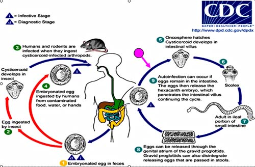 Chu kỳ của loài ký sinh trùng Hymenolepis nana bắt đầu từ khi trứng được nuốt/ ăn vàobởi một người hoặc một động vật thông qua nguồn nước hoặc thức ăn nhiễm trứng. Ấu trùng rỗi sẽ chọc xuyên qua thành ruột vào trong ruột non và phát triển thành dạng ấu trùng cysticercoid larvae. Một khi ruột bị đi xuyên qua, ấu trùng sẽ qua trở lại thành ruột và dính vào thành niêm mạc của chúng để phát triển thành dạn trưởng thành. Các trứng rồi sẽ đi ra khỏi cơ thể qua phân, chu trình tự nhiễm có thể xảy ra, mặc dù, khi trứng ly giải các phôi của chúng và xuyên qua thành ruột non tạo ra một sự nhiễm trùng từ bên trong thay vì nhiễm từ nguồn nước hoặc thực phẩm nhiễm trứng. Tuổi thọ của giun trưởng thành có thể kéo dài đến 4 - 6 tuần, nhưng với chu trình tự nhiễm, một người có thể nhiễm Hymenolepis nana đến nhiều năm. Nếu bạn nghi ngờ bạn có thể nhiễm Hymenolepis nana, nên đến gặp khám bác sĩ chuyên khoa ký sinh trùng để được chẩn đoán và điều trị sớm.