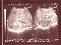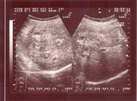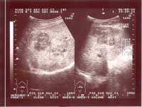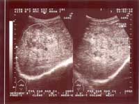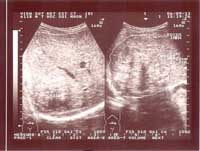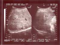 Hình ảnh 7: Khối tổn thương gan do SLGL sau điều trị 3 tháng: Thay đổi chưa đáng kể, một khối tăng âm xen lẫn nhiều micro áp - xe | Hình ảnh 8: Khối tổn thương gan do SLGL sau 3 tháng điều trị bằng Egaten, thay đổi đáng kể:Hai khối tăng âm ít rõ, không rõ giới hạn |