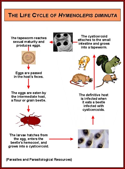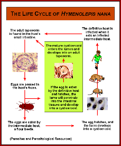 6.Ohio State University, 2001. "Hymenolepis nana (Vampirolepsis nana)" (On-line). Parasites and Parasitological Resources. Accessed October 14, 2004 at http://www.biosci.ohio-state.edu/~parasite/hymenolepis_nana.html.