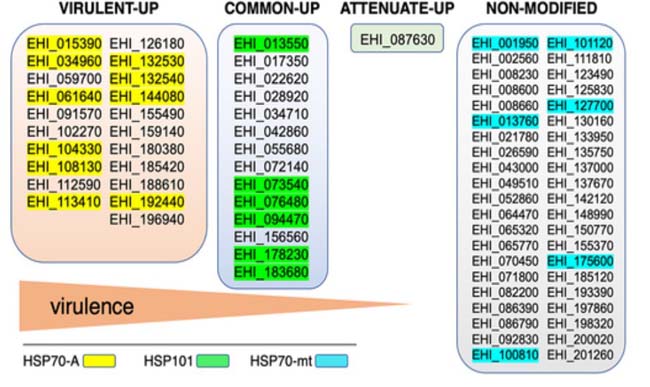 Hình 9. Phản ứng stress của thể tư dưỡng hoạt động gây bệnh liên quan đến protein sốc nhiệt thuộc họHSP70.Trong bộ gen của E. histolytica HM1:IMSS, người ta đã xác định được 86 gen mã hóa protein HSP. Trong đó, 78 gen có phản ứng phiên mã ở các thể hoạt động trải qua OS (stress oxy hóa). Phân tích biểu hiện gen của thể hoạt động chịu stress cho thấy họ gen mã hóa HSP70 được điều hòa tăng ưu tiên (tỉ lệ thay đổi >3) ở amíp có độc lực cao, các gen mã hóa HSP101 dường như được điều hòa tăng ưu tiên ở cả amíp gây bệnh và giảm độc lực, trong khi chỉ có một gen mã hóa một yếu tố phiên mã HSP được điều hòa tăng ở amíp giảm độc lực. Ngoài ra, 42 gen mã hóa HSP được biểu hiện ở mức mRNA tương đương ở cả hai loại thể hoạt động trải qua OS. Tiền tố EHI, theo sau bởi số tương ứng với mã số gen trong cơ sở dữ liệu AmoebaDB (AmoebaDB.Org).