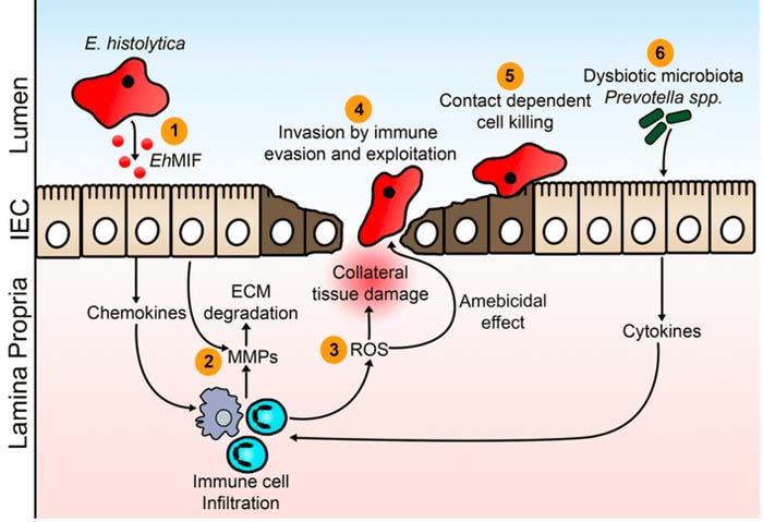 1. Yếu tố ức chế di cư đại thực bào do E. histolytica tiết ra (EhMIF) thúc đẩy viêm niêm mạc. 2. Viêm do E. histolytica gây ra dẫn đến tăng sản sinh metalloproteinase ngoại bào (MMPs) phá vỡ chất nền ngoại bào (ECM) trong ruột để thúc đẩy di chuyển tế bào. 3. Các tế bào viêm xâm nhập tạo ra các gốc tự do oxy (ROS) có khả năng tiêu diệt ký sinh trùng. Các gốc tự do oxy cũng gây ra tổn thương mô lân cận trong quá trình viêm. 4. E. histolytica xâm nhập vào niêm mạc ruột bằng cách trốn tránh và lợi dụng hệ thống miễn dịch của vật chủ. 5. E. histolytica tiêu diệt tế bào phụ thuộc tiếp xúc. 6. Nồng độ P. copri tăng cao làm tăng nguy cơ viêm đại tràng. |