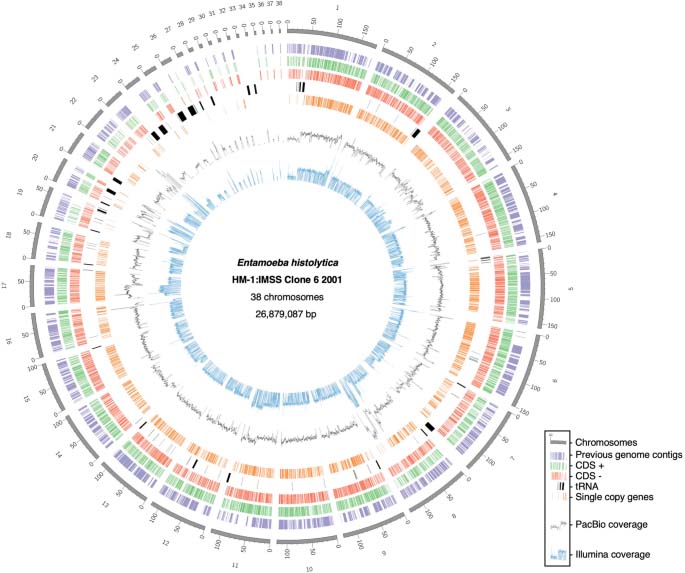 Biểu đồ này chỉ ra tòa bộ cấu trúc với chiều dài, chú giải và PacBio và Illumina đọc bộ gen của E. histolytica HM-1:IMSS Clone 6 2001. Từ ngoài vào trong, khung va chiều dài mới của chúng (block màu xám với một 1:10 kb), các đoạn trình tự liên tục thu được từ các đoạn reads (đoạn trình tự nhỏ) gối nhau của bộ gen trước đây (mã cột màu tím, trình tự mã hóa + sợi (mã cột màu xanh lá), trình tự mã hóa -sợi (mã cột màu cam), gen tRNA (mã cột màu đen), gen đơn bản sao (mã cột màu cam), độ bao phủ PacBio (một đường màu đen) và độ bao phủ Illumina (một đường màu xanh da trời) |
