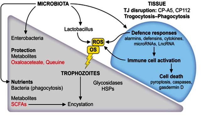 Sự cân bằng giữa thể hoạt động và bào nang bị ảnh hưởng mạnh bởi hệ vi sinh.Thứ nhất,amíp ăn thực bào vi khuẩn và các chất dinh dưỡng từ quá trình này thúc đẩy sự phát triển của thể hoạt động. Các sản phẩm do vi khuẩn tiết ra như axit béo chuỗi ngắn (SCFAs) được dự đoán sẽ cung cấp năng lượng cho sự phát triển ký sinh trùng. Trong quá trình thiếu nguồn carbon, SCFAs kích thích sản xuất mucin, chất này có thể được sử dụng làm nguồn carbon. Acetate là một SCFA gây ra quá trình tạo nang trong ống nghiệm ở E. histolytica. Thứ hai, một hoạt động quan trọng vi khuẩn là hoạt động như một nguồn hỗ trợ ký sinh trùng sống sót trong tình huống stress oxy hóa (OS); nó điều hoà biểu hiện gen amíp, các chất chuyển hóa như oxalacetic và queuine, có nguồn gốc từ Enterobacteriaceae, bảo vệ E. histolytica khỏi OS. Phản ứng này không phổ biến vì Lactobacillus acidophilus (một lợi khuẩn) sửa đổi hệ phiên mã amíp khác nhau và gây ra quá trình oxy hóa các protein quan trọng của E. histolytica dẫn đến chết thể hoạt động. Các tổn thương lớn xảy ra ở giai đoạn đầu tiếp xúc giữa E. histolytica và biểu mô ruột dẫn đến phá vỡ các mối nối chặt chẽ kết hợp với sự phá vỡ các kênh ion, cấu trúc mô bị phá vỡ. Các tế bào động vật có vú chết do“nhấm nháp” tế bào, quá trình chết theo chương trình và thực bào. Phản ứng viêm xảy ra dẫn đến chết tế bào, hệ vi sinh vật ảnh hưởng đến hoạt động của alarmin. |
