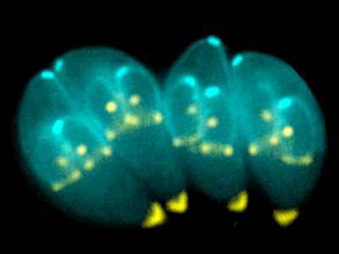 Loài ký sinh trùng hình lưỡi liềm này thường xâm nhập vào hệ thống thần kinh trung ương của con người. Con người bị nhiễm chúng do ăn thịt chưa nấu chín hoặc do tiếp xúc với phân mèo bị nhiễm bệnh. Hầu hết mọi người đã tiếp xúc với ký sinh trùng này một lần và sinh ra kháng thể miển nhiễm với nó. Nhưng một vài cá nhân có hệ miễn dịch yếu và cả bào thai có thể bị ảnh hưởng nghiêm trọng dẫn đến tử vong do nhiễm bệnh... Triệu chứng nhiễm: cúm, sốt, ớn lạnh, mệt mỏi, đau đầu.