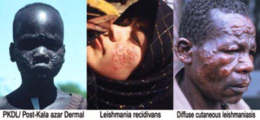 - Bệnh Leishmania nội tạng: còn gọi là bệnh Kala azar do L. donovani, bệnh này đã gặp ở Việt Nam. KST xuất hiện rất nhiều trong gan, lách, hạch bạch huyết, não, tủy xương, niêm mạc ruột…Bệnh nhân sốt 39-400C, ngày 2 lần sốt, tiêu chảy, sụt cân, gan to, lách to. Hồng cầu, bạch cầu và tiểu cầu trong máu đều giảm; tuyến thượng thận bị suy khiến da xạm. Nếu không điều trị, bệnh nhân chết trong vòng 2 năm; nếu điều trị không triệt để , bệnh chuyển sang hậu Kala azar: trên da có những vùng trắng, nổi cục chứa đầy KST.
