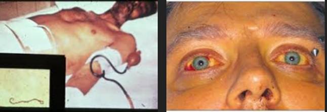 ·Sau phase đầu tiên (với sốt, run lạnh, nhức đầu, đau cơ, nôn mửa và tiêu chảy), bệnh nhân có thể hồi phục một thời gian ngắn nhưng sau đó biểu hiện đau lại;