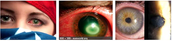 Viêm loét giác mạc: Mi sưng nề, bệnh nhân khó mở mắt (dấu hiệu co quắp mi). Cương tụ rìa, mạch máu kết mạc sâu cương tụ đỏ vùng quanh giác mạc, nhạt dần về phía cùng đồ. Có thể cương tụ và phù nề toàn bộ kết mạc. Giác mạc đục do thâm nhiễm của tế bào viêm, bề mặt mất bóng, gồ ghề. Nếu có tổn thương biểu mô hoặc loét: nhuộm fluorescein (+). Có thể có mủ tiền phòng, phản ứng mống mắt - thể mi. Tổn thương giác mạc có thể có một hoặc nhiều ổ loét, ổ loét có thể tròn hoặc hình bầu dục; có thể ở trung tâm hoặc ở vùng rìa, có thể nhỏ hoặc rộng gần hết diện giác mạc. Nguyên nhân do vi khuẩn: Nhu mô bị tổn thương viêm mủ dày đặc và phù xung quanh. Nhu mô bị hoại tử tróc ra tạo ổ loét lõm sâu, bờ ổ loét nham nhở, đáy ổloét thường có hoại tử bẩn có tiết tố mủ nhày dính vào. Ổ loét do trực khuẩn mủ xanh thường tiến triển rất nhanh. Chỉ sau 1-2 ngày ổ loét đã phát triển lan rộng, thâm nhiễm tỏa lan trong nhu mô và nhanh chóng phát triển thành một ổ áp xe mầu vàng chiếm phần lớn hoặc thậm chí toàn bộ giác mạc.