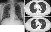 Hình 4 (a) Hình chụp X-quang ngực theo hướng từ sau ra trước cho thấy có sự bất thường của rốn phổi bên phải ở một bệnh nhân nhiễm sán lá phổi Paragonimusspp.