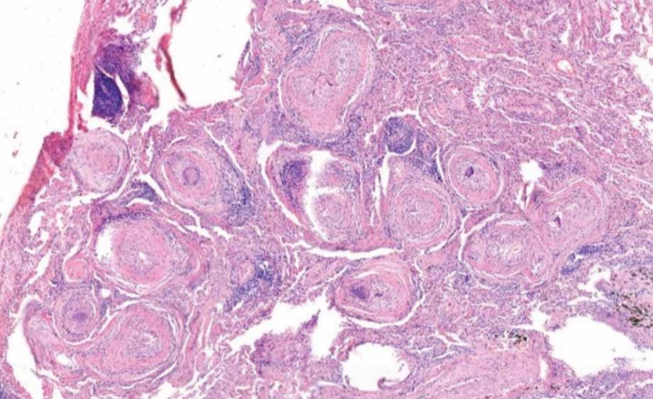 Hình 5.Biểu hiện mô bệnh học của mẫu mô cho thấy sự phát triển viêm u hạt mãn tính với nhiều trứng